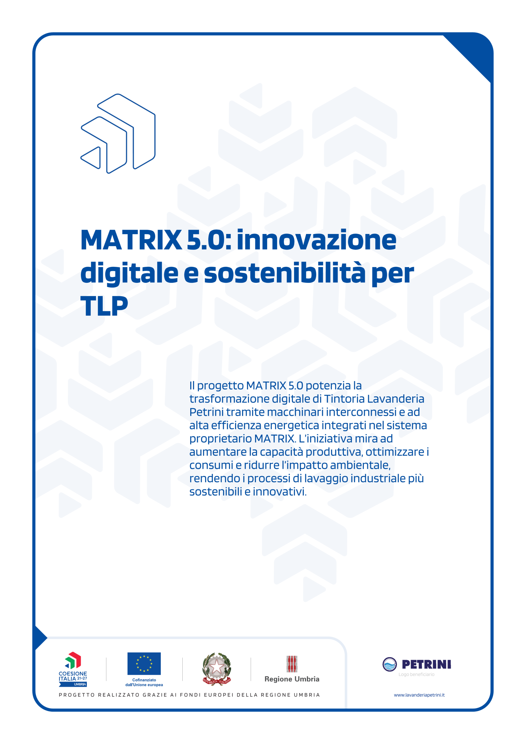 Il progetto MATRIX 5.0 potenzia la trasformazione digitale di Tintoria Lavanderia Petrini tramite macchinari interconnessi e ad alta efficienza energetica integrati nel sistema proprietario MATRIX. L’iniziativa mira ad aumentare la capacità produttiva, ottimizzare i consumi e ridurre l’impatto ambientale, rendendo i processi di lavaggio industriale più sostenibili e innovativi.sistema sviluppato da Tintoria Lavanderia Petrini S.r.l. in grado di integrare i dati provenienti dai diversi processi aziendali e utilizzarli per il monitoraggio, la valutazione e l’ottimizzazione in tempo reale delle varie attività aziendali.